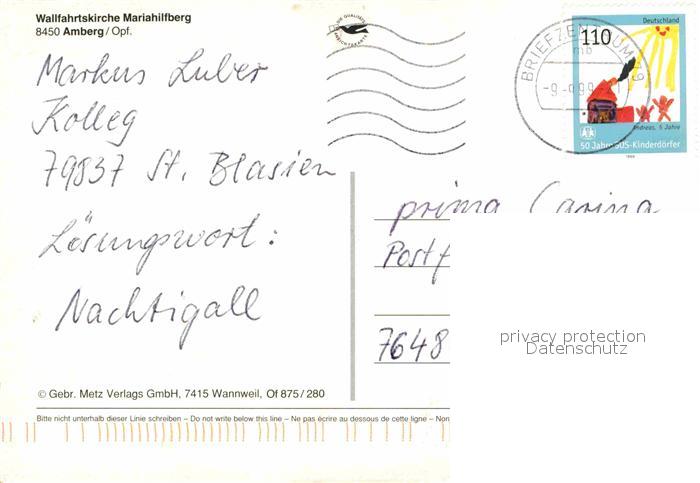 72743056 alte Postkarte Amberg Oberpfalz Wallfahrtskirche Mariahilfberg postalisch gelaufen Erhaltung siehe scans [FriedD77] KatCode: 11110009361000