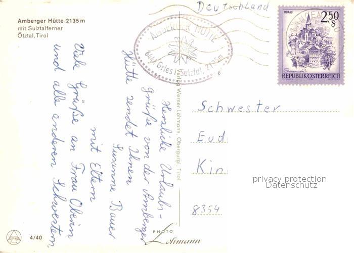 72619663 alte Postkarte Ambergerhuette mit Sulztalferner oetztaler Alpen postalisch gelaufen Erhaltung siehe scans [FriedD77] KatCode: 11390334070208