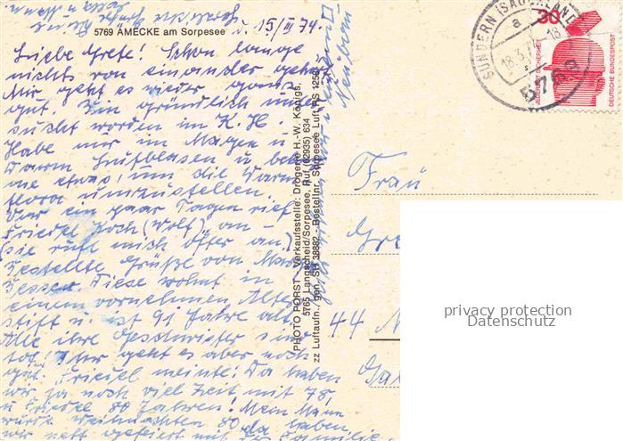 74035054 alte Postkarte Amecke Panorama Sorpesee postalisch gelaufen Fliegeraufnahme Erhaltung siehe scans [FriedD77] KatCode: 11110005958044