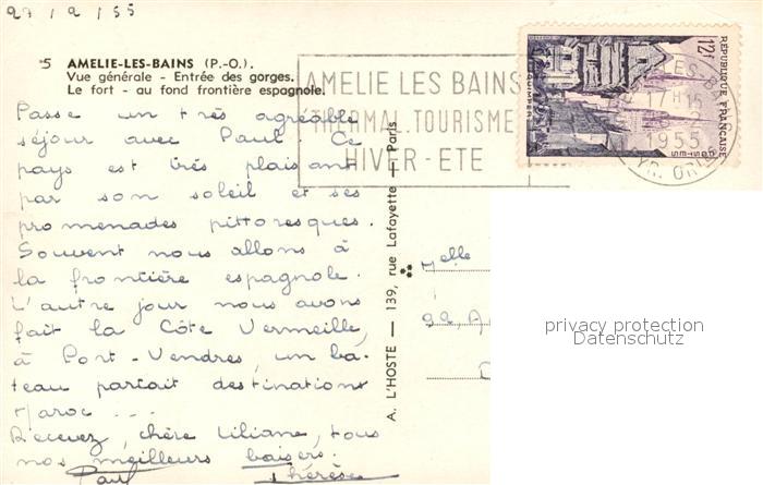 13535234 carte postale Amelie-les-Bains-Palalda Vue Generale de la ville Entrée des gorges Fort Frontière espagnole postalisch gelaufen Erhaltung siehe scans [FriedD77] KatCode: 11170066166003