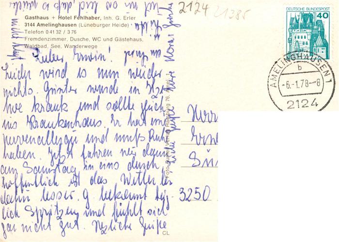 73893171 alte Postkarte Amelinghausen Lueneburger Heide Gasthaus Hotel Fehlhaber Gastraum Heidelandschaft postalisch gelaufen Erhaltung siehe scans [WerneD78] KatCode: 11110003355002