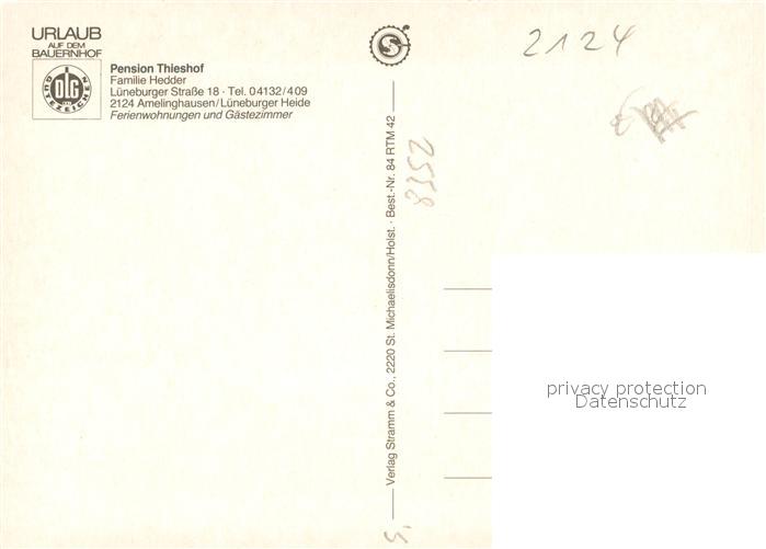 73662932 Amelinghausen Lueneburger Heide Pension Thieshof Urlaub auf dem Bauernhof postalisch nicht gelaufen Erhaltung siehe scans [FriedD77] KatCode: 11110003355002