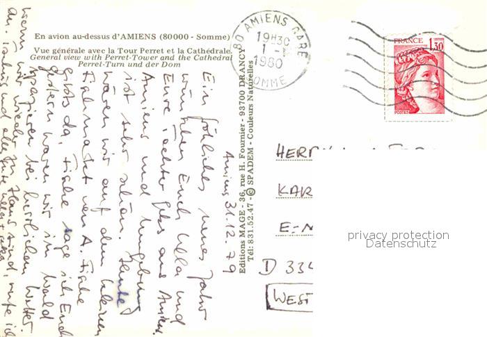 12787150 carte postale Amiens Fliegeraufnahme Perrel Turm Dom postalisch gelaufen Erhaltung siehe scans [AndreD76] KatCode: 11170080280021