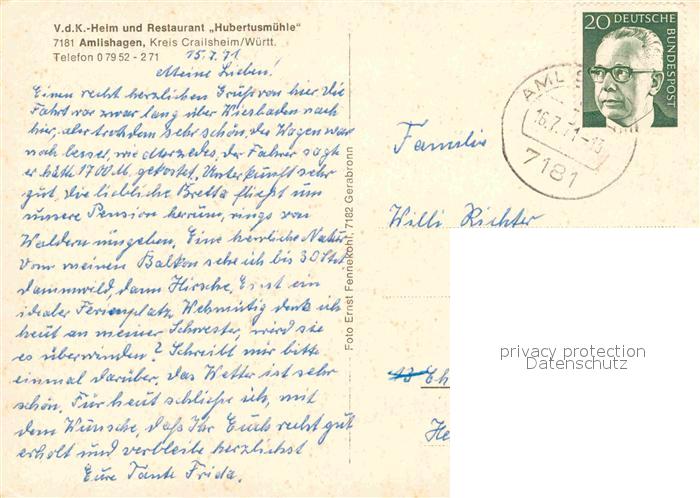 72878405 alte Postkarte Amlishagen Retaurant Hubertusmuehle postalisch gelaufen Erhaltung siehe scans [AndreD76] KatCode: 11110008127032