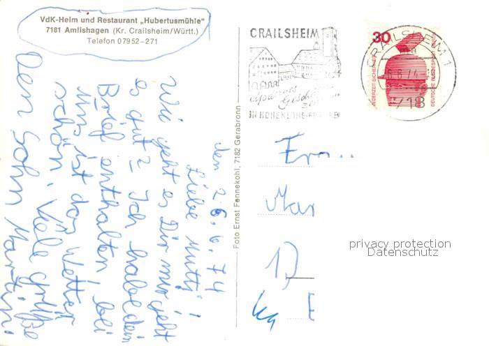 72663246 alte Postkarte Amlishagen VdK-Heim Restaurant Hubertusmuehle postalisch gelaufen Erhaltung siehe scans [NatalD47] KatCode: 11110008127032