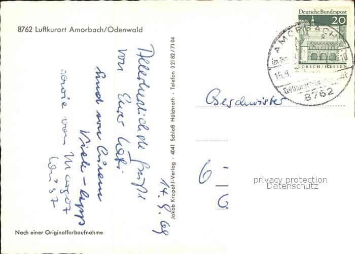 72444736 alte Postkarte Amorbach Miltenberg Platz Saeule Fachwerkhaus Kirchtuerme Luftkurort im Odenwald postalisch gelaufen Erhaltung siehe scans KatCode: 11110009676112