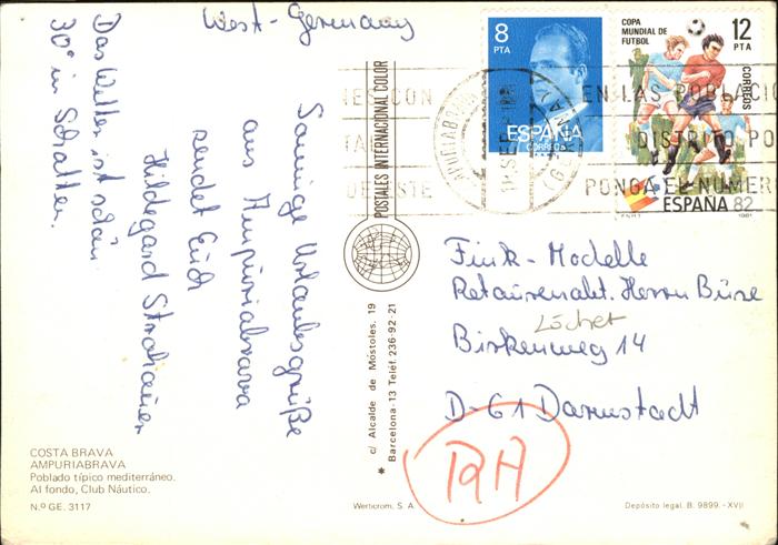 old postcard Ampuriabrava Poblado tipico mediterraneo Club Nautico postalisch gelaufen Erhaltung siehe scans