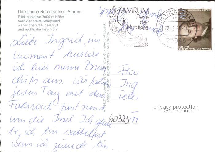 72597280 alte Postkarte Amrum Nordseeinsel Fliegeraufnahme aus ca. 3000 m Hoehe postalisch gelaufen Erhaltung siehe scans [FriedD77] KatCode: 11110001054085