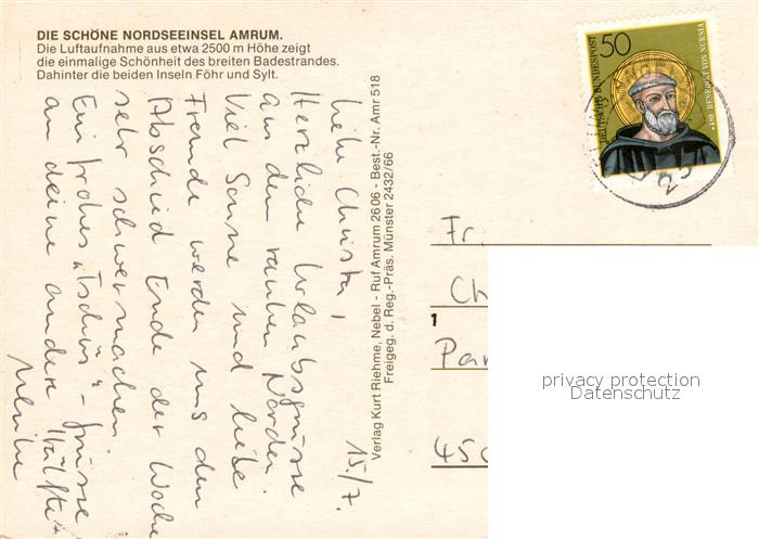 73667512 alte Postkarte Amrum Nordseeinsel mit Inseln Foehr und Sylt Luftaufnahme aus ca. 2500 m Hoehe postalisch gelaufen Erhaltung siehe scans [FriedD77] KatCode: 11110001054085