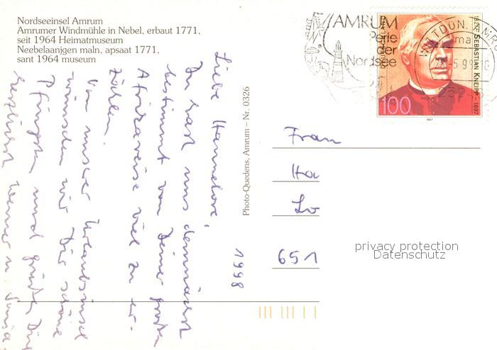 73182370 alte Postkarte Amrum Windmuehle postalisch gelaufen Erhaltung siehe scans [NatalD47] KatCode: 11110001054085