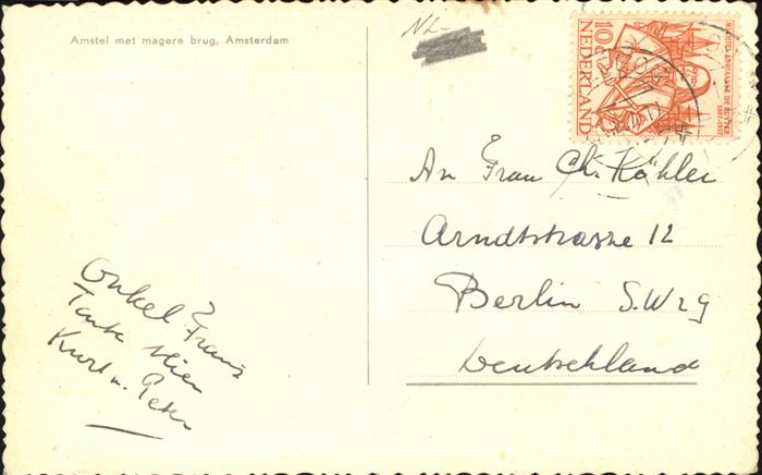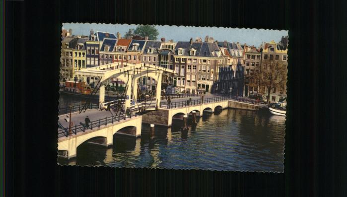 old postcard Amsterdam Niederlande Amstel met mager brug postalisch gelaufen