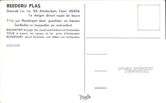 Amsterdam Niederlande Reederij Plas Ausflugsboot postalisch nicht gelaufen Erhaltung siehe scans