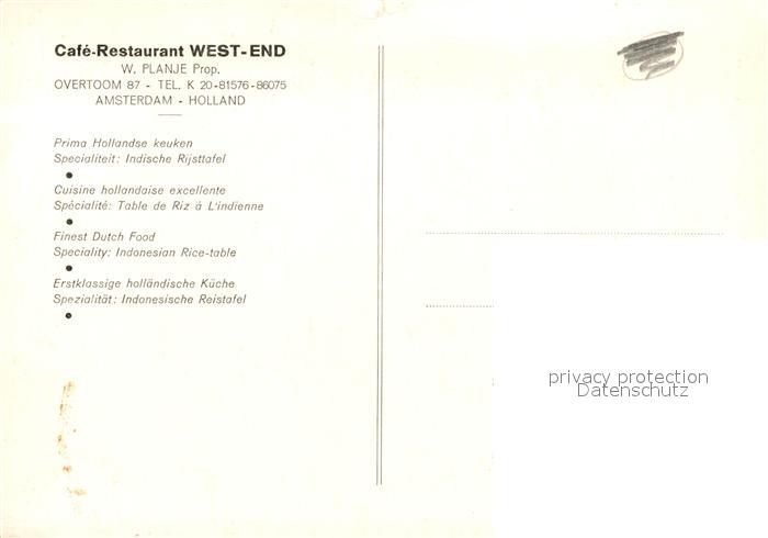 13330106 Amsterdam Niederlande Restaurant West-End postalisch nicht gelaufen Erhaltung siehe scans [KathaD81] Kath Katcode 11370900