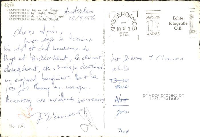 old postcard Amsterdam Niederlande Singel bei Nacht postalisch gelaufen Erhaltung siehe scans
