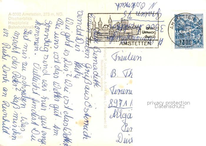 13237379 alte Postkarte Amstetten Niederoesterreich Stadtpanorama oetscherblick Hauptplatz Bahnhofstrasse Kirche postalisch gelaufen Erhaltung siehe scans [FriedD77] KatCode: 11390121030502