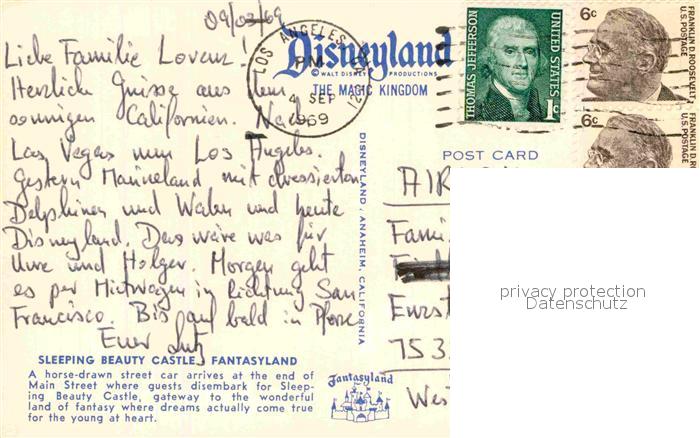 72844987 old postcard Anaheim Fantasyland Disneyland Sleeping Beauty Castle horse drawn street car postalisch gelaufen Erhaltung siehe scans [FriedD77] KatCode: 14140050000000