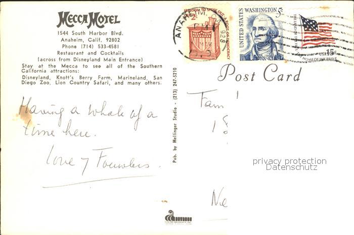 72227076 old postcard Anaheim Mecca Hotel postalisch gelaufen Erhaltung siehe scans KatCode: 14140050000000