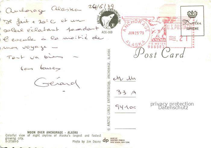 74033608 old postcard Anchorage Alaska USA Moon over the city night skyline postalisch gelaufen Erhaltung siehe scans [FriedD77] KatCode: 14140020000000