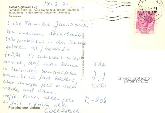 old postcard Andalo Paradiso dello sci nelle Dolomiti di Brenta Wintersportplatz Dolomiten postalisch gelaufen Erhaltung siehe scans [FriedD77]