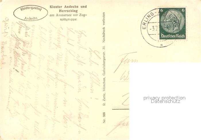 73668528 alte Postkarte Andechs Kloster Andechs und Herrsching am Ammersee mit Zugspitzgruppe postalisch gelaufen Erhaltung siehe scans [WerneD78] KatCode: 11110009188117