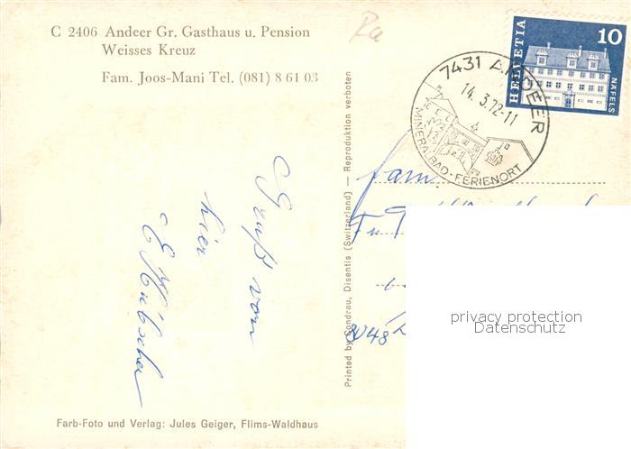 13865728 alte Postkarte Andeer GR Gasthaus Pension Weisses Kreuz postalisch gelaufen Erhaltung siehe scans [FriedD77] KatCode: 11470100315020