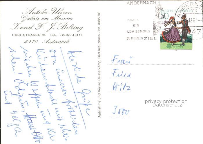 72112723 alte Postkarte Andernach Rhein Rheinland-Pfalz Galerie am Museum antike Uhren postalisch gelaufen Erhaltung siehe scans KatCode: 11110007137003