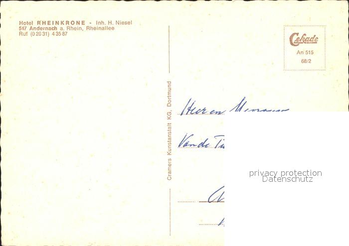 72255250 Andernach Rhein Rheinland-Pfalz Hotel Rheinkrone postalisch nicht gelaufen Erhaltung siehe scans KatCode: 11110007137003