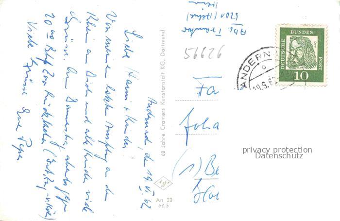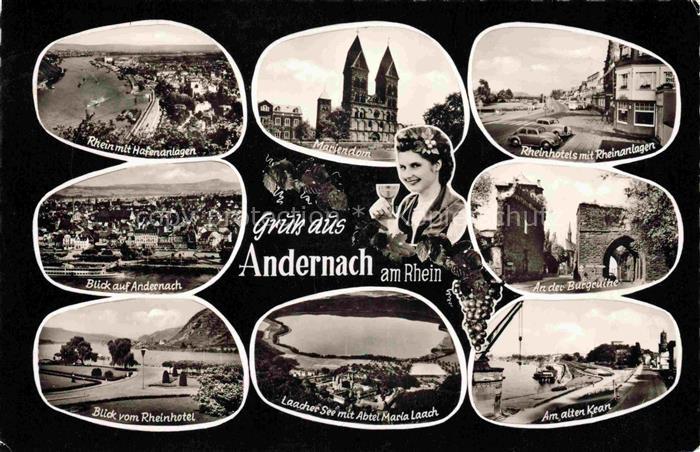 74124465 alte Postkarte Andernach Rhein Rheinland-Pfalz Panorama Rhein Rheinhotel Mariendom Burgruine Laacher See Abtei Maria Laach Am alten Kran postalisch gelaufen Erhaltung siehe scans [FriedD77] KatCode: 11110007137003