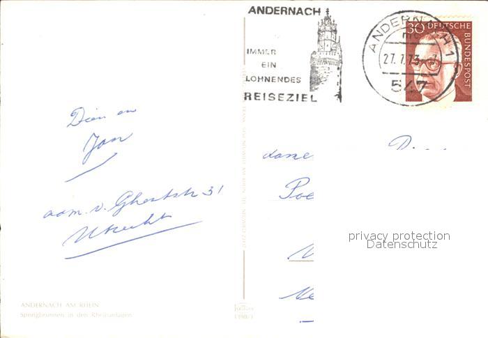 72433510 alte Postkarte Andernach Rhein Rheinland-Pfalz Springbrunnen in den Rheinanlagen postalisch gelaufen Erhaltung siehe scans KatCode: 11110007137003
