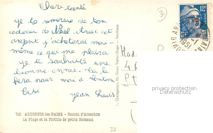 13504427 carte postale Andernos-les-Bains Bassin d’Arcachon La Plage et la Flotille de petits Bateaux postalisch gelaufen Erhaltung siehe scans [WerneD78] KatCode: 11170033633005