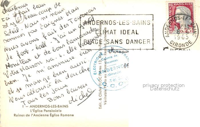 13585005 Andernos-les-Bains Eglise Paroissiale Ruines de l’ancienne Eglise Romaine postalisch gelaufen Erhaltung siehe scans [FriedD77] carte postale Frie Katcode 11170033633005