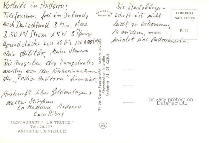 Andorra La Vella Restaurant La Truite postalisch nicht gelaufen Erhaltung siehe scans [KathaD81]