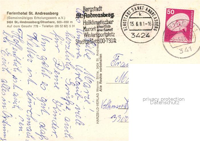 73164700 alte Postkarte Andreasberg Harz St Ferienhotel Sankt Andreasberg postalisch gelaufen Erhaltung siehe scans [KathaD81] KatCode: 11110003153010