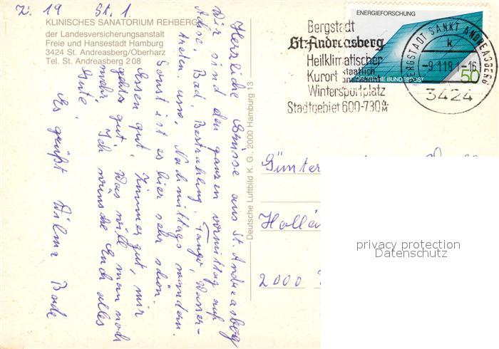 73106469 alte Postkarte Andreasberg Harz St Fliegeraufnahme Klinisches Sanatorium Rehberg postalisch gelaufen Erhaltung siehe scans [KathaD81] KatCode: 11110003153010