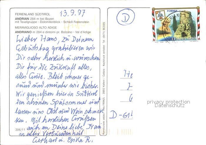 old postcard Andrian mit Texelgruppe Dolomiten Schloss Festenstein postalisch gelaufen Erhaltung siehe scans