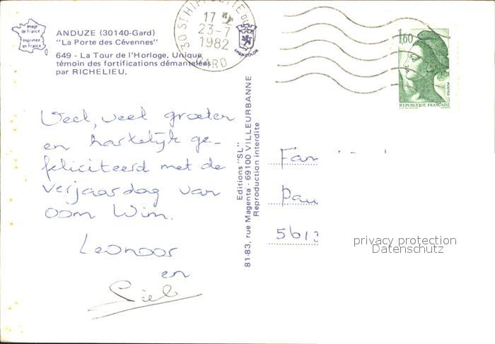 12272849 carte postale Anduze Tour de l Horloge Fortification Richelieu Restaurant postalisch gelaufen Erhaltung siehe scans KatCode: 11170030130010
