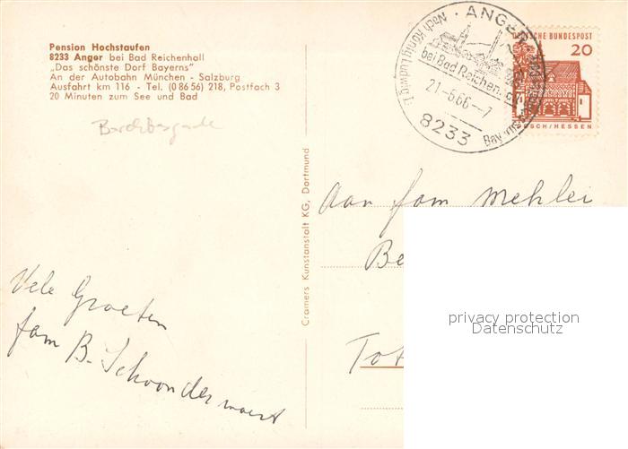 73653014 alte Postkarte Anger Bad Reichenhall Pension Hochstaufen Gastraum Kirche Panorama postalisch gelaufen Erhaltung siehe scans [WerneD78] KatCode: 11110009172114