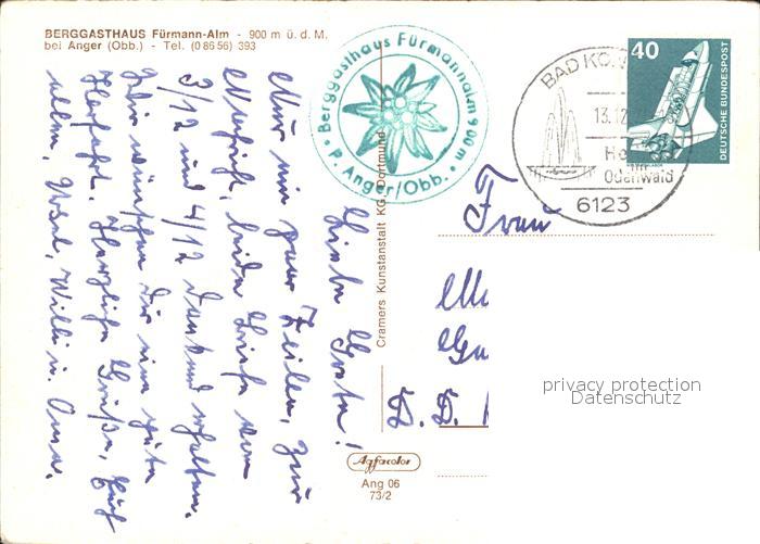 72563463 alte Postkarte Anger Chiemgau Berggasthaus Fuermann-Alm postalisch gelaufen Erhaltung siehe scans [LiesaD40] KatCode: 11110009172112