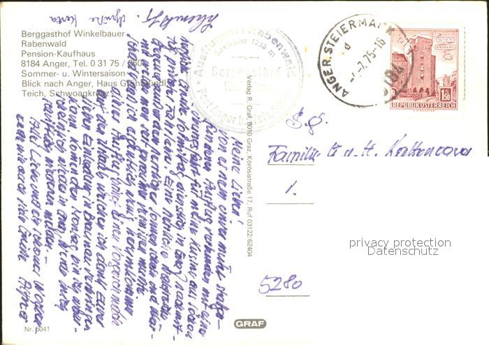 11923638 alte Postkarte Anger oesterreich Berggasthof Winkelbauer Rabenwald Pension Kaufhaus Teich Kirche postalisch gelaufen Erhaltung siehe scans KatCode: 11390224061702
