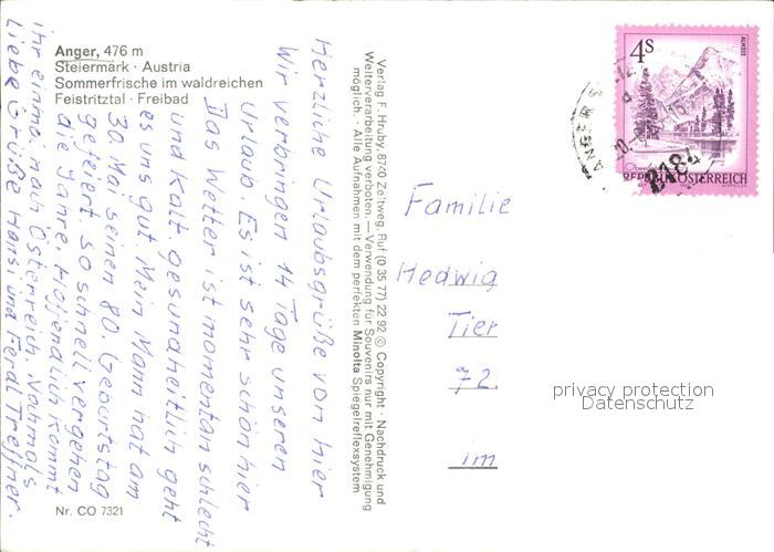 72492168 alte Postkarte Anger Steiermark Schwimmbad Strassenansicht postalisch gelaufen Erhaltung siehe scans KatCode: 11390224061702