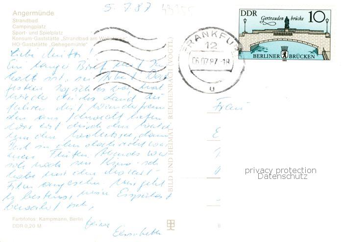 73834443 alte Postkarte Angermuende Strandbad Sport und Spielplatz Konsum Gaststaette Strandbad am Wolletzsee HOG Gehegemuehle postalisch gelaufen Erhaltung siehe scans [FriedD77] KatCode: 11110012073008