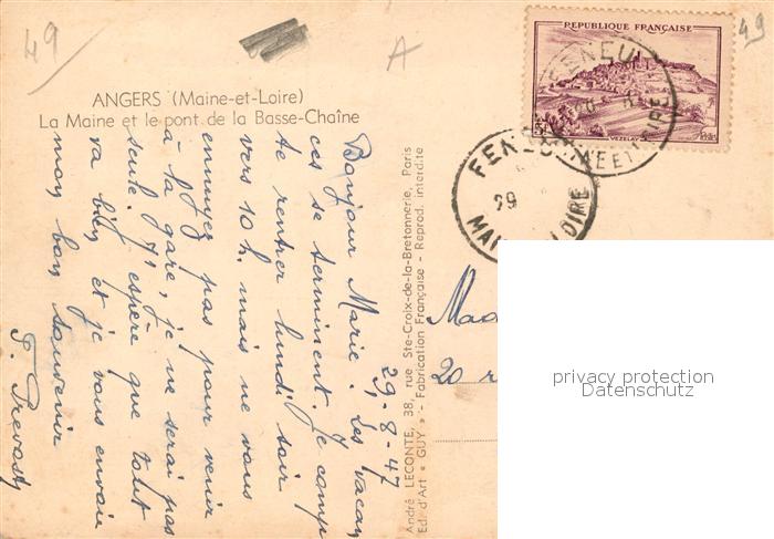 13525615 carte postale Angers La Maine et pont de la Basse Chaîne postalisch gelaufen Erhaltung siehe scans [FriedD77] KatCode: 11170049149007
