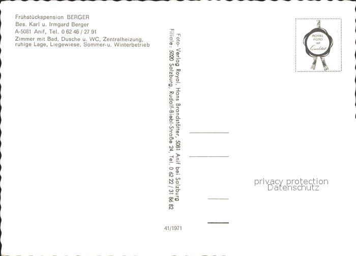 71901782 Anif Fruehstueckspension Berger postalisch nicht gelaufen Erhaltung siehe scans KatCode: 11390323050301