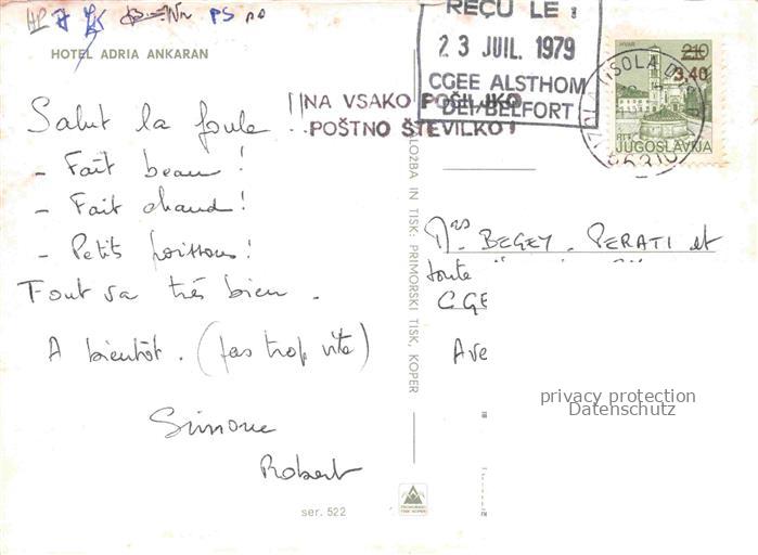 74026429 old postcard Ankaran Ancarano Slovenia Hotel Adria Ortsmotiv mit Kirche Segeln postalisch gelaufen Erhaltung siehe scans [FriedD77] KatCode: 11500