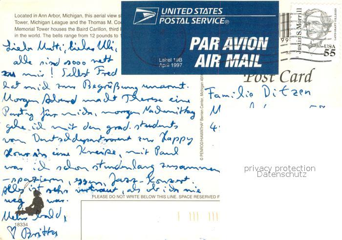 73682617 old postcard Ann Arbor Aerial view Tower Michigan League and Thomas M Cook Memorial Tower houses the Baird Carrillon postalisch gelaufen Erhaltung siehe scans [WerneD78] KatCode: 14140240000000