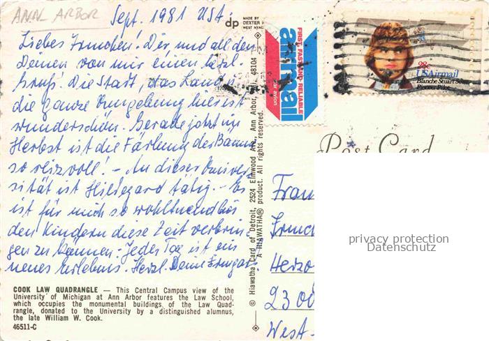 74091767 old postcard Ann Arbor Michigan USA Cook Law Quadrangle Luftaufnahme postalisch gelaufen Erhaltung siehe scans [IrynaD87] KatCode: 14140240000000