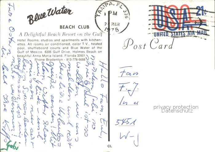 72000661 old postcard Anna Maria Blue Water Beach Club postalisch gelaufen Erhaltung siehe scans KatCode: 14140110000000