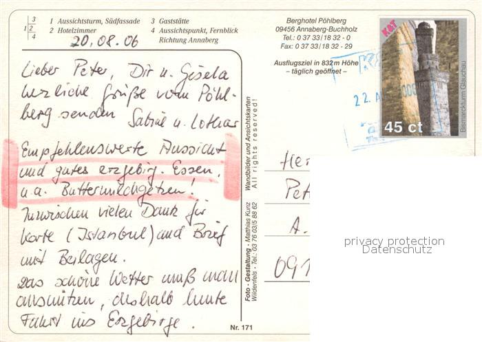 73658655 alte Postkarte Annaberg-Buchholz Erzgebirge Berghotel Poehlberg Aussichtsturm Hotelzimmer Gaststaette Aussichtspunkt Fernblick postalisch gelaufen Erhaltung siehe scans [FriedD77] KatCode: 11110014171010