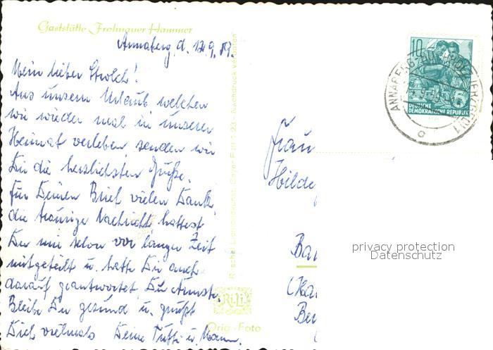 72505754 alte Postkarte Annaberg-Buchholz Erzgebirge Gaststaette Frohnauer Hammer postalisch gelaufen Erhaltung siehe scans KatCode: 11110014171010
