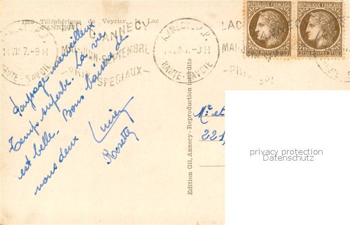 13688974 Annecy Haute-Savoie Téléphérique de Veyrier Terrasse Lac d Annecy postalisch gelaufen Erhaltung siehe scans [FriedD77] carte postale Frie Katcode 11170074174010